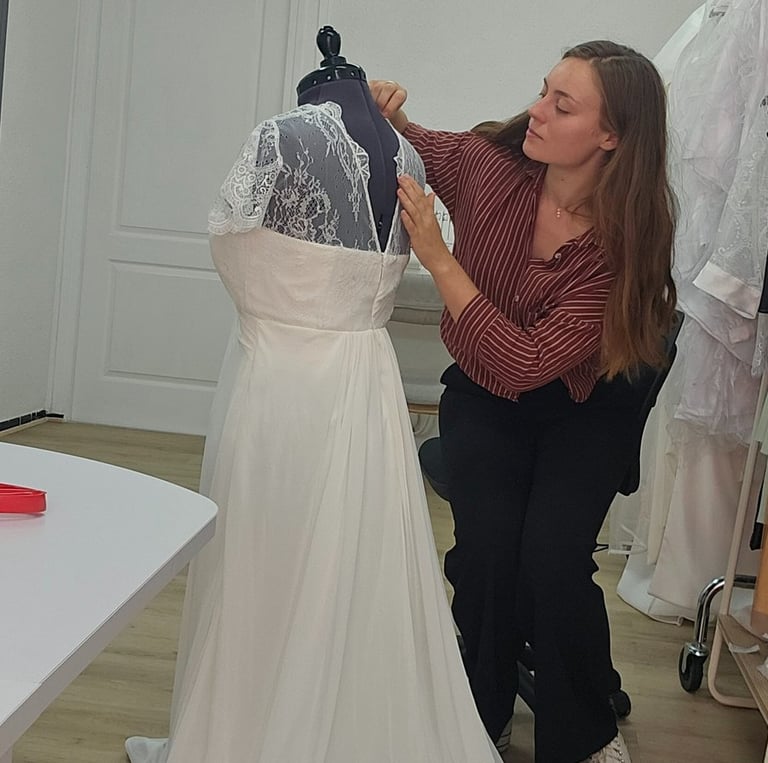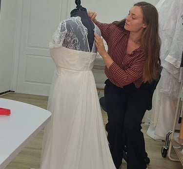 Spécialisée dans le sur-mesure, je crée des robes qui s’adaptent à votre corps, à votre histoire et à votre sensibilité.