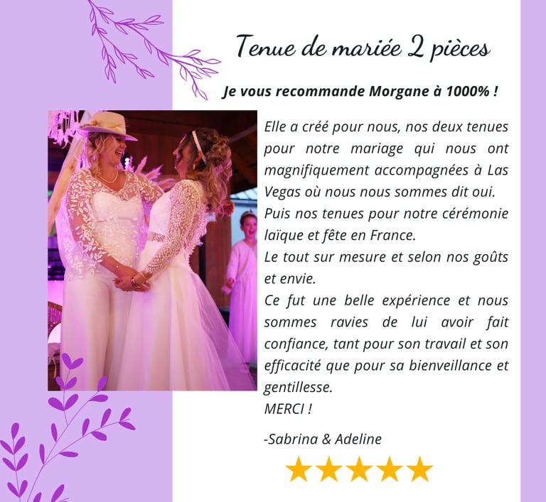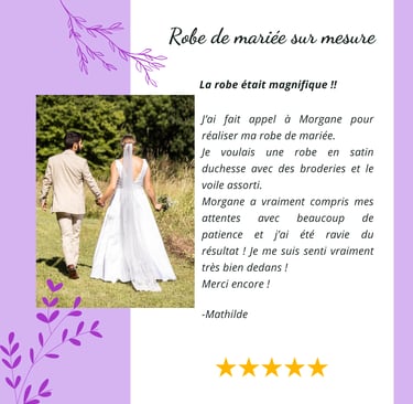 Découvrez notre service sur-mesure dédié à la création de robes de mariée, de soirée et de tous types de vêtements personnalisés. Chaque pièce est conçue avec soin pour refléter vos goûts et votre personnalité. Nous travaillons en étroite collaboration avec nos clientes pour choisir les tissus, les coupes et les détails qui feront de chaque vêtement une œuvre unique. Que ce soit pour le plus beau jour de votre vie ou pour une soirée mémorable, notre expertise et notre passion de la couture garantissent un résultat à la hauteur de vos attentes. Faites de votre rêve une réalité avec notre service de sur-mesure, où chaque création est pensée pour vous embellir et vous mettre en valeur.